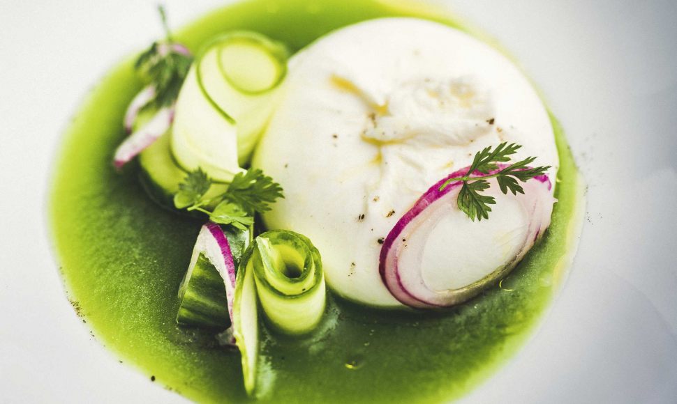 Une entrée aux saveurs italiennes : burrata, oignons rouges marinés, gaspacho de concombre.