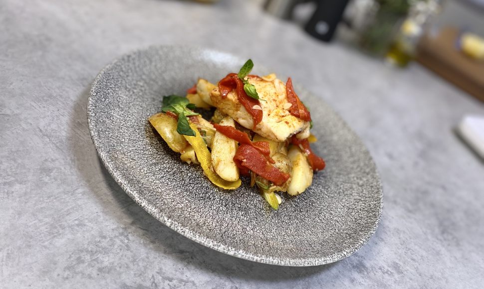 Cabillaud basse température sous-vide, vinaigrette aux couleurs basques, pommes de terre nouvelles