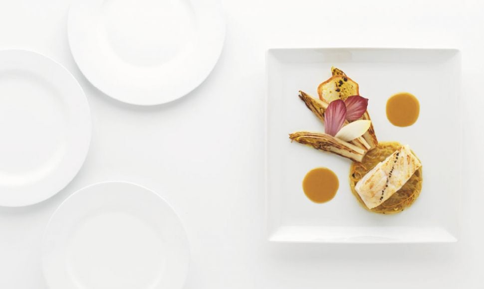 Cabillaud demi-sel poêlé endives cuites et crues, sucs à l’orange