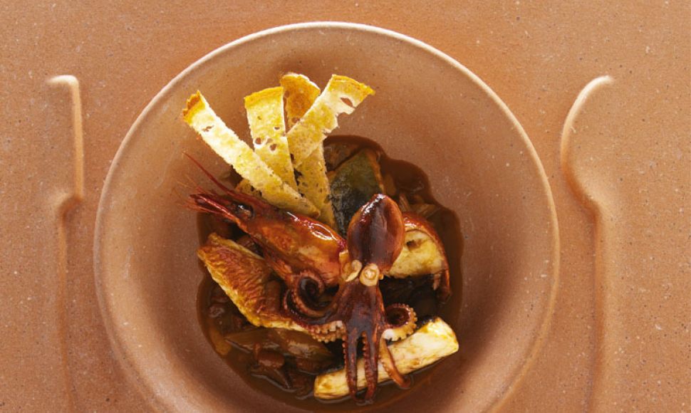 Le « Cacciucco » est une spécialité de Livourne, dont la paternité reste encore objet de recherches et de débas. Un gardien de phare serait l’inventeur de ce plat ou bien il serait né à bord des bateaux de pêche comme moyen de recyclage du rebut de la pêche. Nous avons choisi poissons nobles et crustacés et respecté ce qui caractérise ce plat, tomates et vin rouge.
