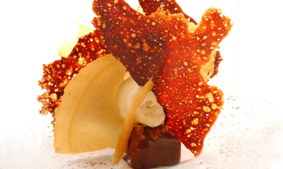 Café-chocolat-nougatine-praliné en feuillet, pignons à la fleur de sel, glaçage caramel