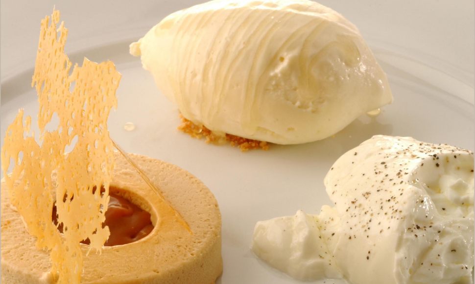 Pour obtenir le parfait, faire chauffer la crème fleurette. Cuire 400 g de sucre afin d’obtenir un caramel, puis déglacer celui-ci avec la crème fleurette chaude. Réserver.