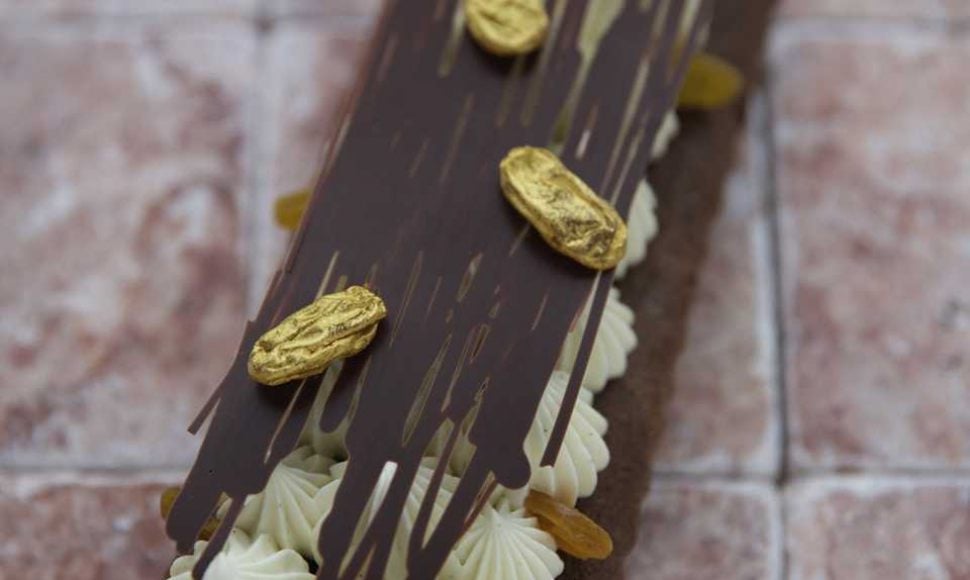 Un cake avec un brownie chocolat au muscovado pour base, accompagné d'une chantilly au rhum brun et marmelade d'ananas.