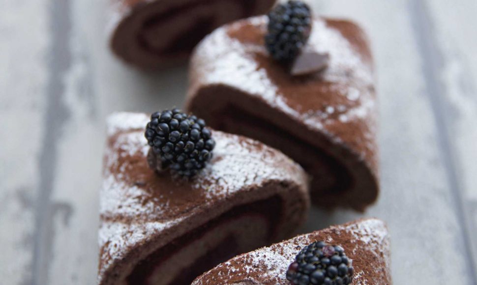 Tamisez la farine et le cacao en poudre. Faites tiédir ensemble le lait et l’huile de pépins de raisin. Fouettez les jaunes d’œufs avec 25 g de sucre semoule pour les blanchir. D’autre part, montez les blancs d’œufs, puis serrez-les avec le restant de sucre semoule. Incorporez délicatement les 2 masses à l’aide d’une maryse, puis ajoutez la farine et le cacao tamisés. Versez délicatement le mélange lait-huile de pépins de raisin tiède sur le tout et mélangez afin d’obtenir une pâte homogène. Étalez-la sur toute la surface de la plaque recouverte du tapis en silicone légèrement huilé, puis enfournez pour 10 min. Laissez refroidir à température ambiante.