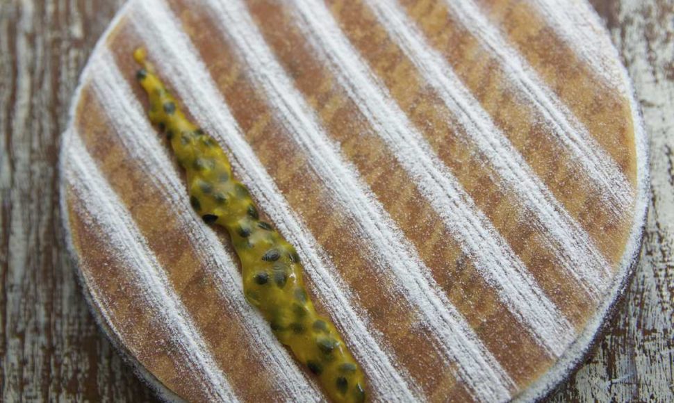 Un cake à la crème d'amande cacao, ganache passion - chocolat au lait, purée de passion et disque de brick.