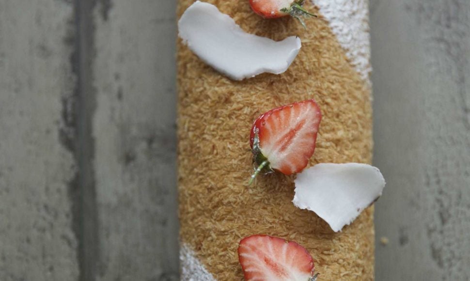 Tamisez la farine. Faites tiédir ensemble le lait et l’huile de pépins de raisin. Fouettez les jaunes d’œufs avec 25 g de sucre semoule pour les blanchir. D’autre part, montez les blancs d’œufs, puis serrez-les avec le restant de sucre semoule. Incorporez délicatement les 2 masses à l’aide d’une maryse, puis ajoutez la farine tamisée et 40 g de noix de coco râpée. Versez délicatement le mélange lait-huile de pépins de raisin tiède sur le tout et mélangez afin d’obtenir une pâte homogène. Étalez-la sur toute la surface de la plaque recouverte du tapis en silicone, saupoudrez uniformément des 20 g de noix de coco râpée restants, puis enfournez pour 10 min. Laissez refroidir à température ambiante sur la grille.