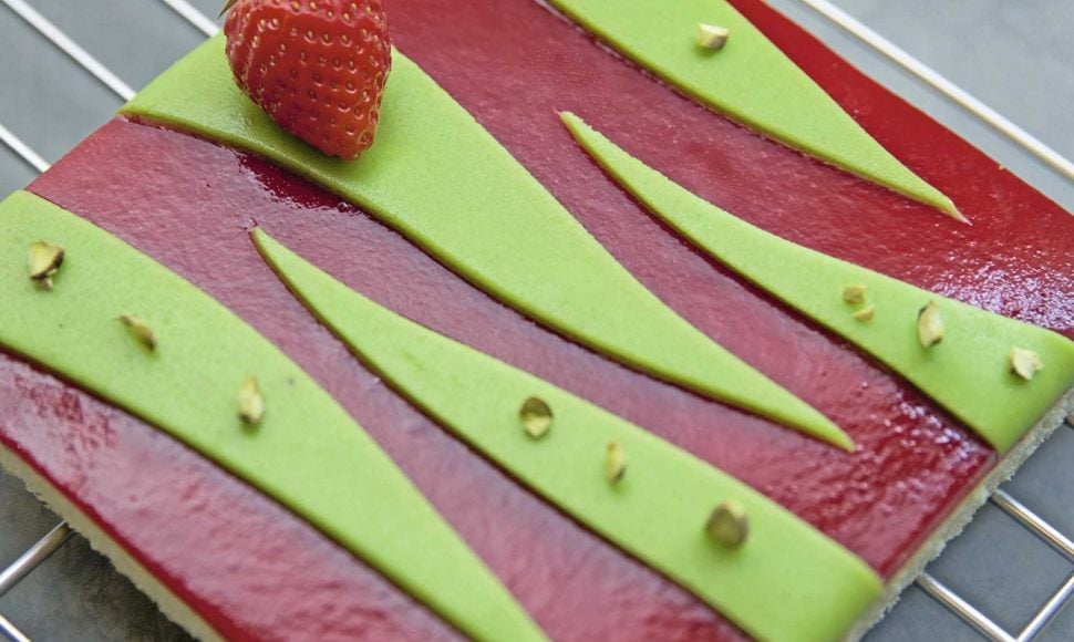 Un cake pensé par Christophe Michalak comme un fraisier : avec une pâte d'amande et une gelée de fraises et framboises.