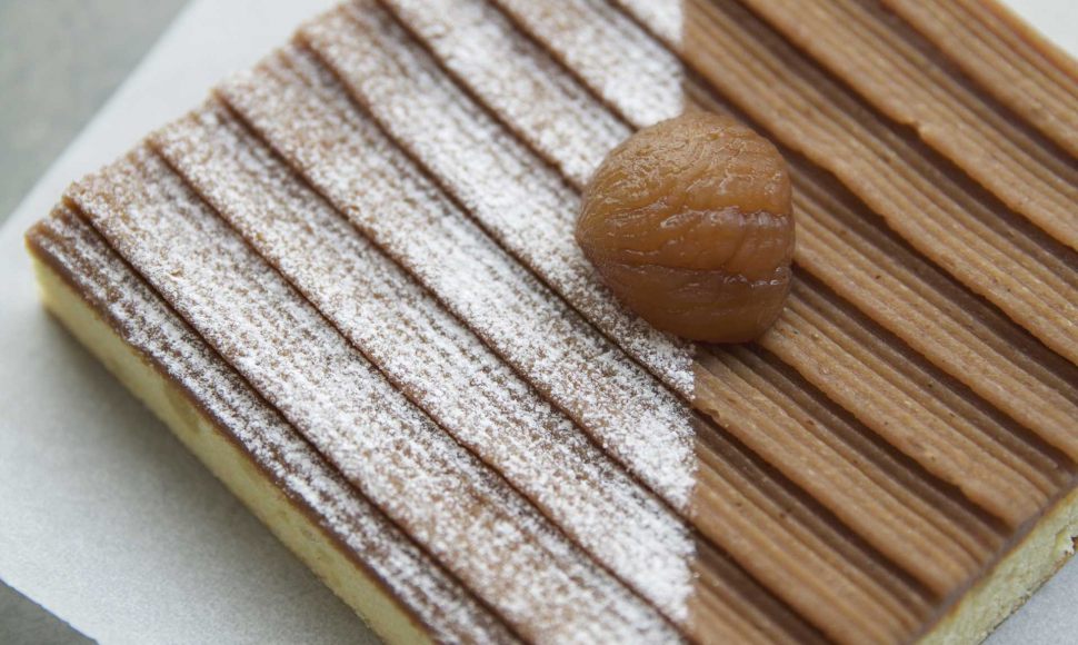Un cake réalisé comme un mont-blanc à la pâte d'amande avec un sirop au rhum et de vermicelles aux marrons.