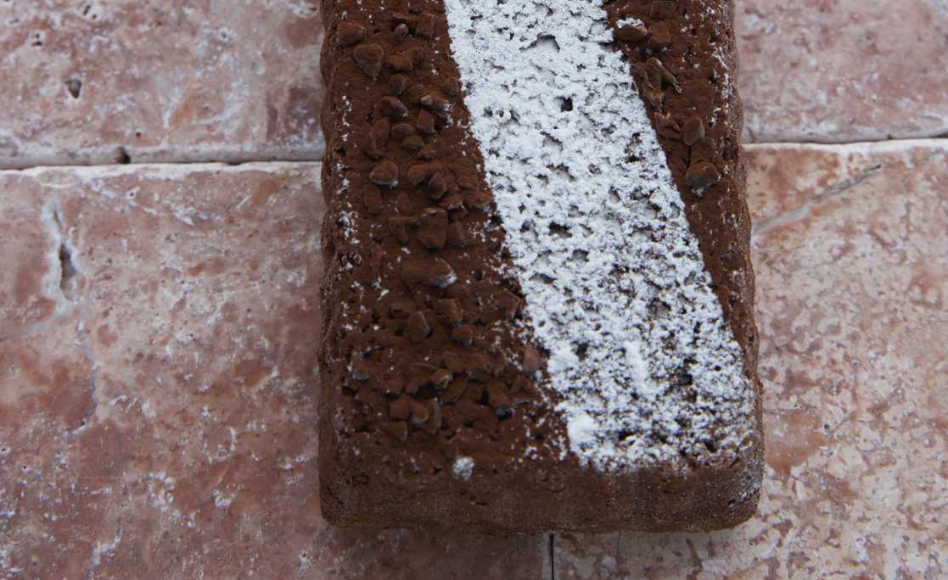 Un cake gâteau basque et brownie chocolat muscovado avec du grué caramélisé.