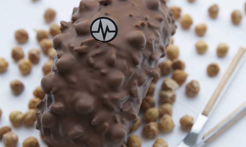 Un gâteau à la fleur d'oranger et au gianduja, chocolat noir, amandes et noisettes caramélisées avec un glaçage au chocolat au lait.