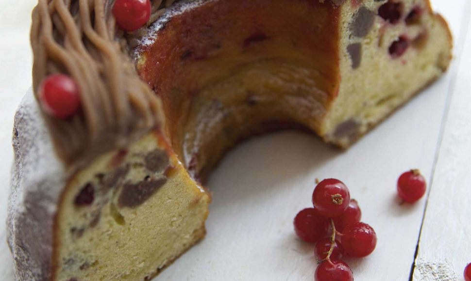 Faites fondre le beurre. Faites blanchir les jaunes d’œufs en les fouettant avec le sucre semoule et les graines des gousses de vanille fendues et grattées pendant 5 min minimum, puis ajoutez la crème fraîche épaisse. Incorporez la farine et la levure, puis le beurre fondu, la pâte de marron détaillée en cubes et les groseilles congelées. Beurrez le moule comme indiqué page 25. Versez l’appareil à cake dans le moule et faites cuire 50 min. Démoulez puis réservez sur la grille.