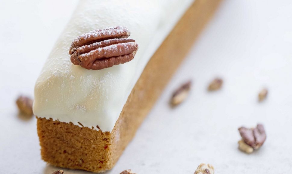 Un cake irrésistible, avec la rondeur de la vanille et le caractère du praliné aux noix de pécan. Cette recette permet d'obtenir deux cakes de 20 x 5 centimètres.