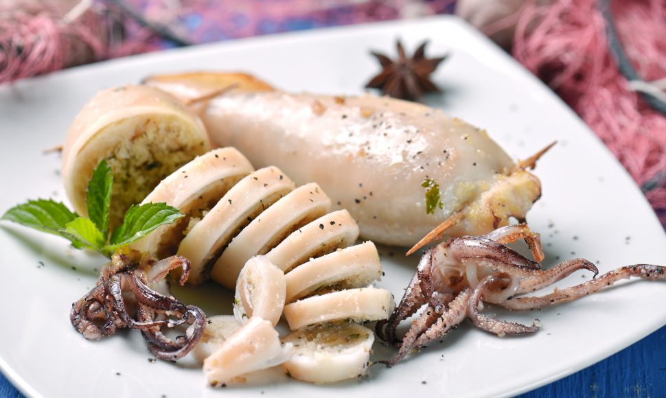 Le terme "mourgate" désigne les calamars sur l’île Maurice. Le chef choisit de les farcir puis de les accompagner d'un riz basmati au lait de coco, le tout servi avec une sauce à l'encre de seiche.