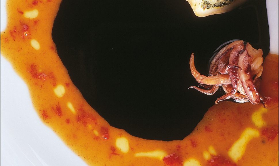 Nettoyer les calmars et retirer la peau qui se trouve sur la poche. Séparer la tête du corps, retirer les intestins et garder précieusement la poche d’encre. La percer au-dessus d’un chinois étamine afin de filtrer l’encre dans un saladier en Inox. La conserver au frais.