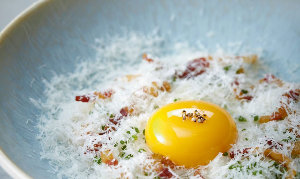 "En regardant un plat de spaghetti à la carbonara, mon imaginaire a transformé les pâtes en calmar ! En détaillant le calmar en fines lamelles, accompagné d’une crème au lard, mon rêve devient réalité…"