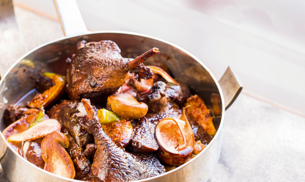 Assaisonnez les cuisses de colvert et faites-les colorer côté peau dans un sautoir. Retirez-les lorsqu’elles ont une belle couleur blonde. Dégraissez le sautoir, puis faites revenir le beurre, les dés d’oignons et de carotte. Ajoutez l’ail en chemise, la branche de thym, le poivre et le genièvre, puis déglacez avec le jus de colvert. Remettez les cuisses de colvert et mouillez à hauteur au fond blanc de volaille. Couvrez et laissez confire pendant 3 h. Au terme de la cuisson, égouttez les cuisses, passez le jus au chinois et ajoutez-le au jus de colvert. Retirez l’os du gras des cuisses, puis réservez.