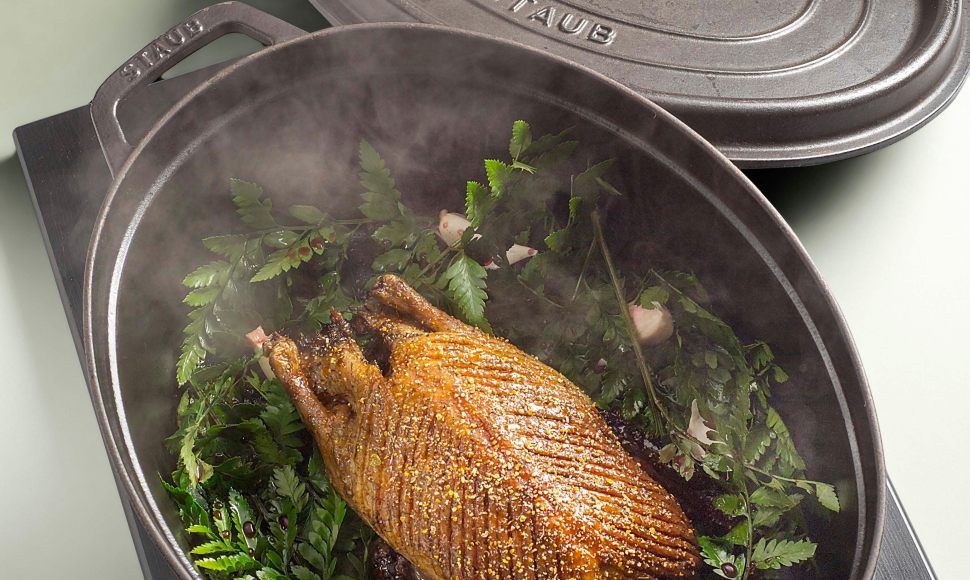 Canette sauvage de chez Madame Burgaud, laqué d’agrumes au poivre de Sansho, radis noir, navets « glaçon »