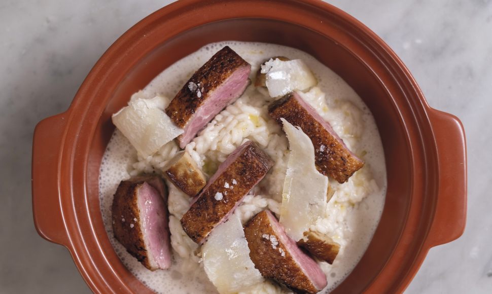 Canette rôtie, risotto et foie gras poêlé, mousseux lacté de parmesan