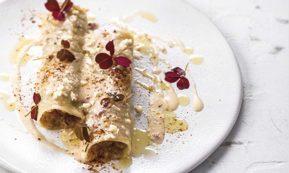 Des cannelloni à la saucisse accompagnés d'une sauce agliata (pain de mie, ail et huile d'olive) originaire de Pise.