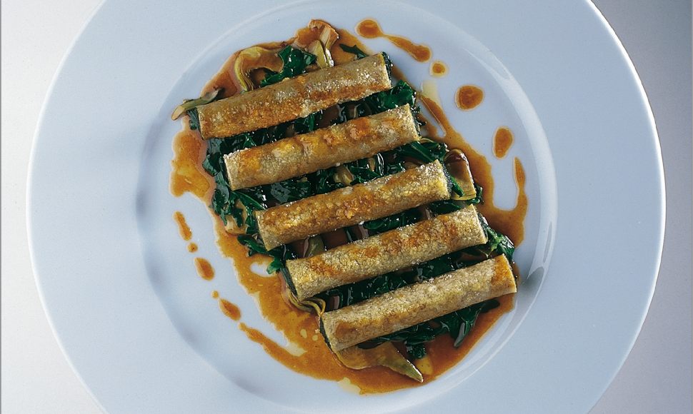 Cannelloni « au vert » juste gratinés, sauté minute d’artichauts épineux