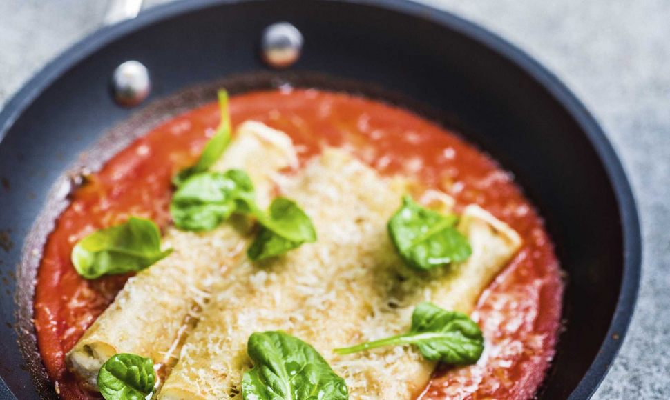 Confectionnez les cannelloni. Dans une poêle ou un plat à gratin, versez la sauce tomate. Déposez dessus les cannelloni et râpez du Grana Padano®. Enfournez pour 5 à 7 min ; le fromage doit être fondu et légèrement gratiné.