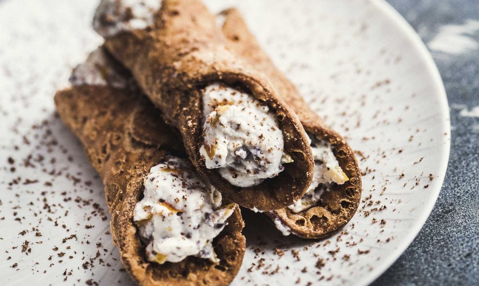 Un dessert de cannoli siciliens à base d'une pâte frite de cacao amer et d'une crème à base de ricotta.