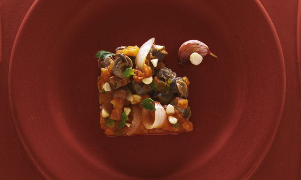 La communauté de Valence est une terre de grands amateurs d’escargots. Selon les endroits, on utilise tout type d’herbes pour parfumer la caragolà. Certains préfèrent enrichir la sauce avec un mélange d’amandes et/ou pain frit, pilés avec des herbes ou des épices. Nous avons choisi un délicat mariage d’aromates et utilisé des amandes pilées mais aussi concassées.