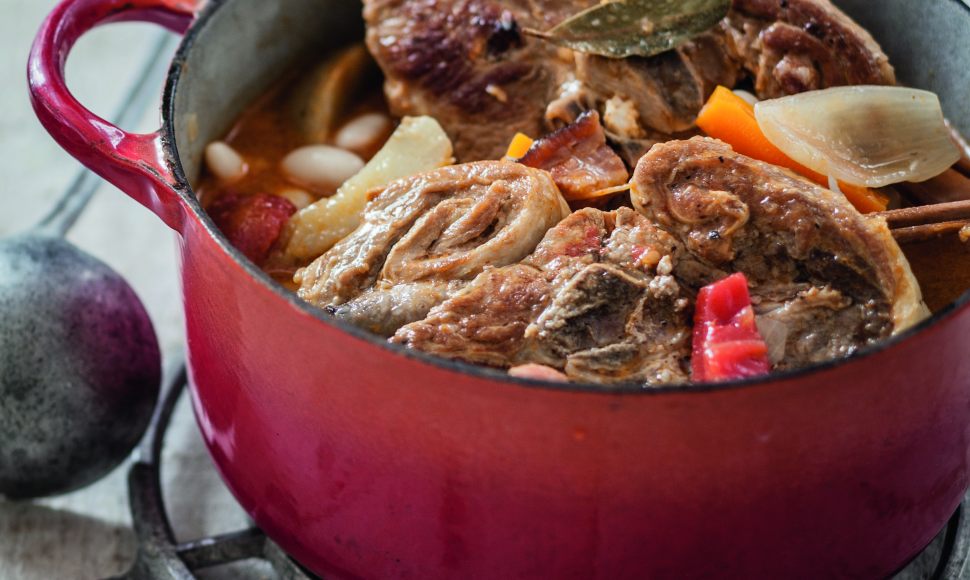 Taillez la poitrine salée en lardons et enfoncez 3 lardons dans chaque morceau de viande, côté chair cette fois. Mettez les tranches de gigot dans un plat creux, salez, poivrez et arrosez d’un filet d’huile. Placez au réfrigérateur pour la nuit. Mettez également les haricots secs à tremper pour la nuit.