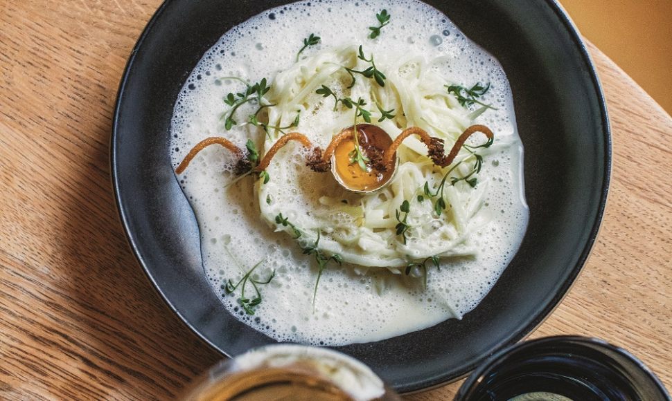 Le mot du chef : « Hélène, ma filleule de 12 ans qui n’aimait pas les asperges, les adore dans cette recette en trompe-l’œil. J’aime faire apprécier des produits en les détournant pour faire tomber les a priori. Pour réussir à lui en faire manger, je les ai maquillées en leur donnant l’aspect de pâtes à la carbonara… »