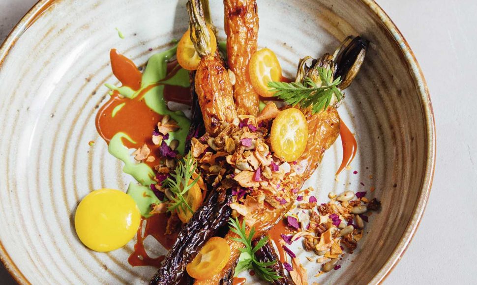 Des carottes rôties accompagnées d'une sauce à la carotte, d'une sauce à la fêta à l'estragon, crumble de tournesol et purée de kumquats.