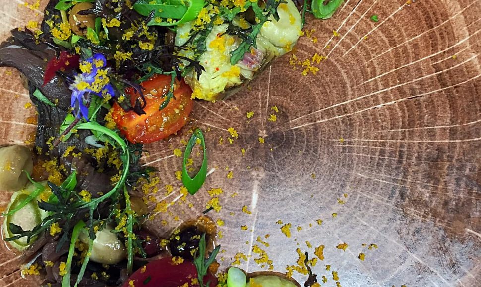 Assaisonner la salade. Dresser à votre goût, ajouter les oignons pickles et râper de la poutargue.