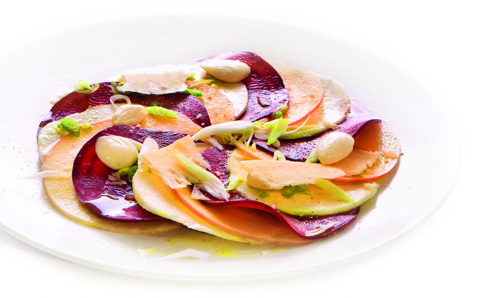 Pour surprendre vos convives, apprenez à réaliser le carpaccio de pomme, artichaut et betterave d'Alain Ducasse. Préparez les artichauts avec un jus de citron, coupez les betteraves, taillez les pommes en fines tranches avant d'assembler le tout en une jolie rosace. Agrémentée d'amandes fraîches, de cébette, d'huile d'olive et de copeaux de parmesan, cette entrée vous offrira originalité et légèreté.