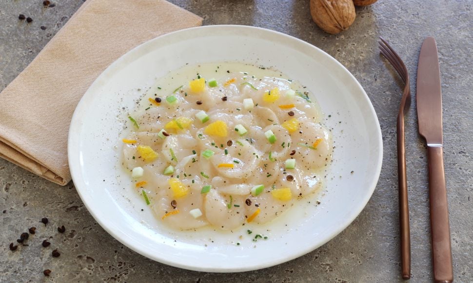 Carpaccio de Saint-Jacques, huile de noix, poivre de Timut et agrumes