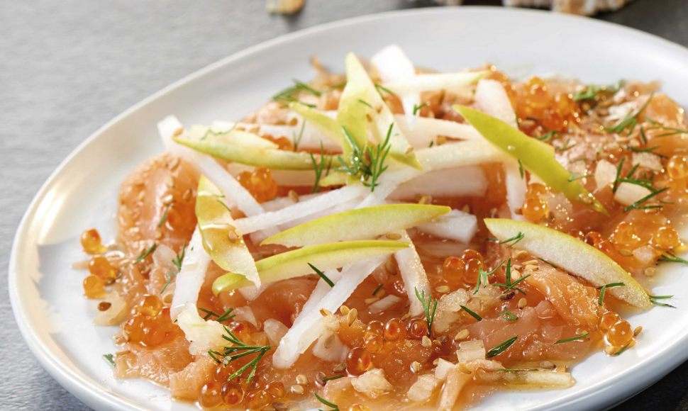 Une salade de radis bien fraîche sur un lit de saumon, on y ajoute des pommes pour la fraîcheur et de la sauce soja.