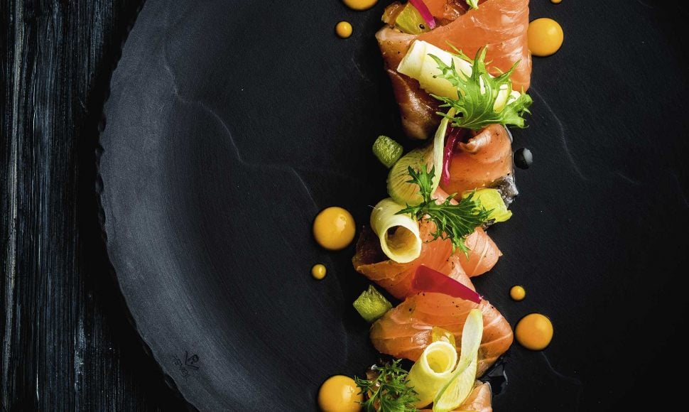 Carpaccio de saumon mariné à la fleur de sel citronnelle, oignon rouge pickles, condiment mangue-curcuma