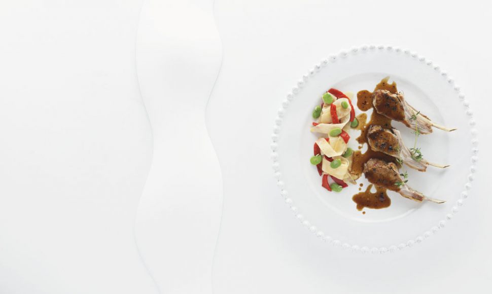Carré d’agneau moutonné des Pyrénées rôti à la crème d’ail, céleri, févettes et jus au thym