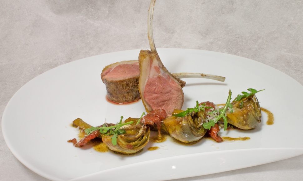 Carré d’agneau rôti au sautoir, artichauts et tomates confites