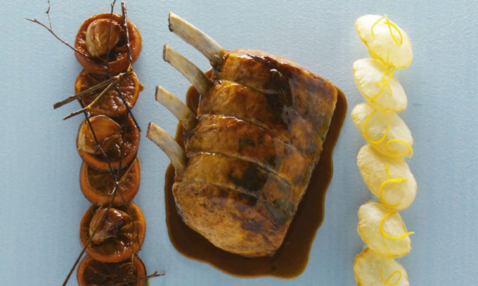 Les oranges sont très présentes dans la cuisine de Malte. Dans cette recette, le carré de porc, enduit d’aromates, est cuit avec un jus d’orange caramélisé. Nous avons gardé tous les ingrédients en les utilisant autrement. Et nous avons ajouté des pommes soufflées.