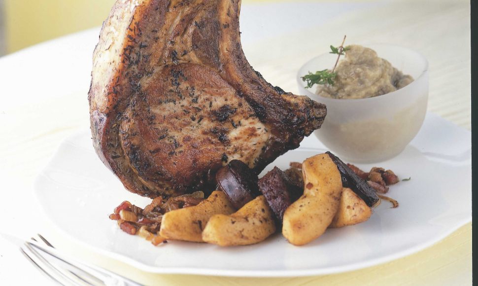 Du porc rôti et une purée d'aubergines accompagnés de boudins noirs aux pommes et lardons.