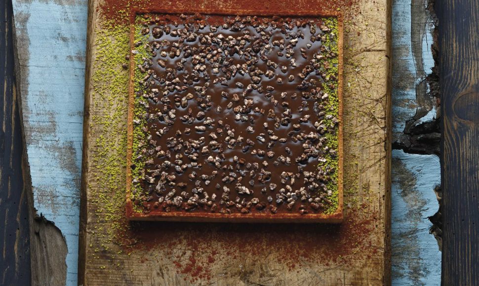 Une tarte sucrée-salée, dotée d'une ganache onctueuse gianduja-pistache, agrémentée de grué caramélisé.