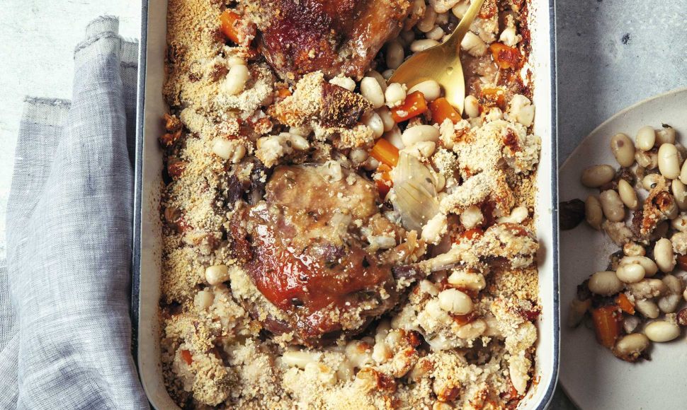 Déposez canard et gigot dans un plat allant au four. Versez dessus les haricots avec les légumes (sauf le bouquet garni). Saupoudrez bien de chapelure et enfournez pour 1 h.
