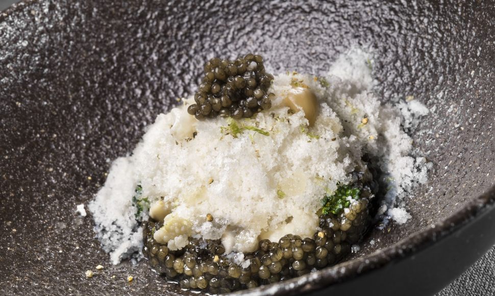 Caviar alverta impérial, neige de chou-fleur, noisettes fraîches