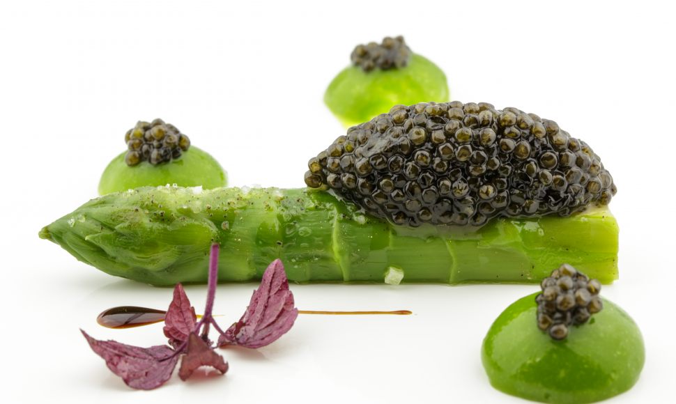 Laver puis tailler les asperges à 10 cm de la queue. Passer un côté à la mandoline pour faire une assise puis faire une incision rectangle de 4,5. Cuire 5 min à l'eau et réserver.