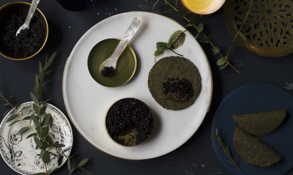 Une illusion de caviar réalisé avec du tapioca et des feuilles de nori, accompagné d'une crème de lentille, le tout sur une galette de sarrasin aux algues, idéale pour Noël.