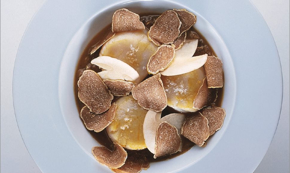 Cèpes d’auvergne en marmelade, sucs de cuisson réduits, noix de Saint-Jacques au four, râpée de tartufi di Alba