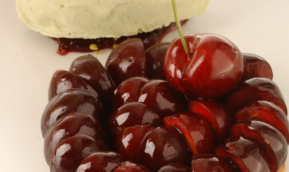Cerises fraîches en tuile friande, crème au kirsch, glace à la pistache
