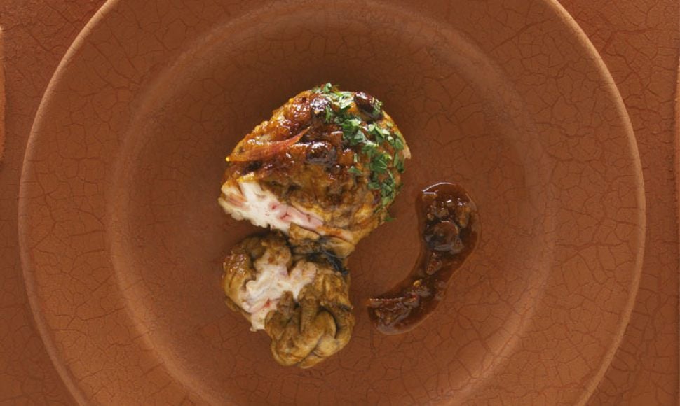 La « Cervelle à la chermoula » est un plat cuisiné par les femmes en période de Ramadan. Coupée en petits morceaux, la cervelle de mouton est cuite en tagine, avec une chermoula à base de piments, de cumin et de vinaigre. Nous nous en sommes inspirés et l’avons transformée.