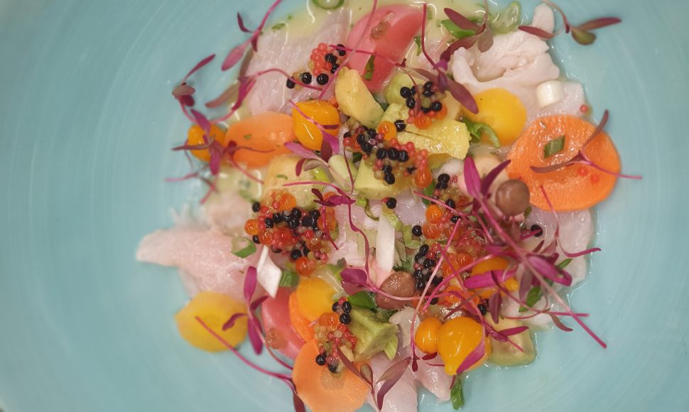 Verser sur le carpaccio de bar le lait du tigre et laisser mariner au frais 15 minutes.