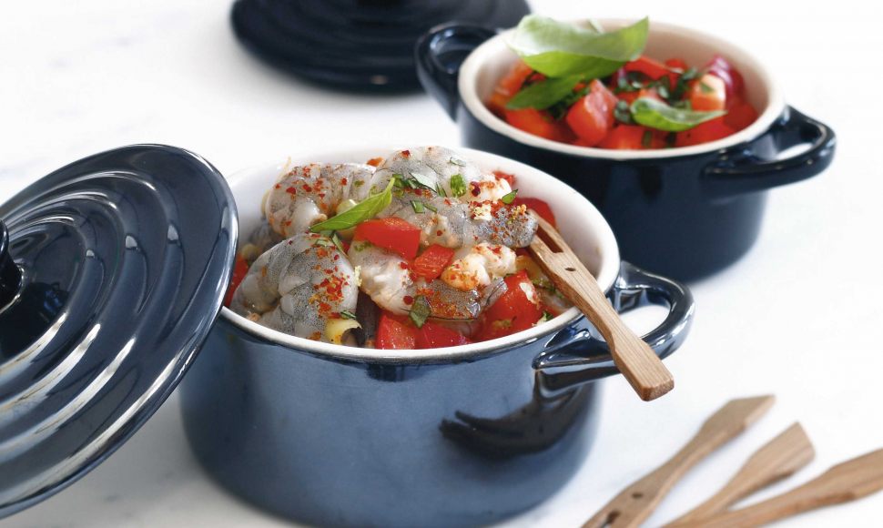 Préparez la marinade : mélangez 2 c. à s. d’huile d’olive avec le jus de citron, le nuoc-mâm, le piment et la citronnelle hachée. Décortiquez les crevettes et coupez les queues en deux dans la longueur. Taillez les poivrons en petits dés.