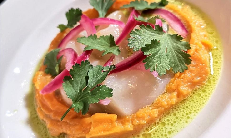 Ceviche, patate douce fumée, sauce Leche de Tigre